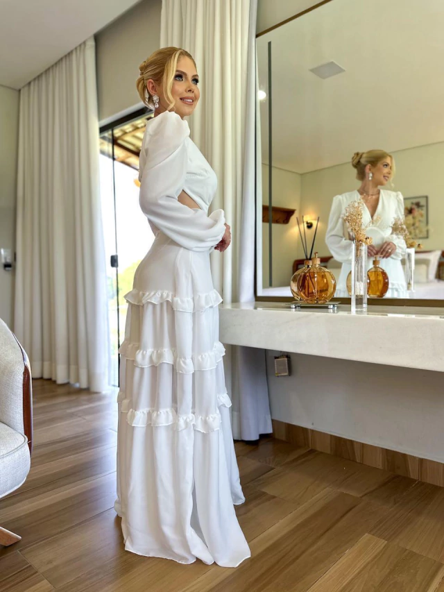Imaginar-se em um vestido chiffon com manga longa é visualizar elegância e sofisticação. Este vestido é uma escolha perfeita para eventos especiais que exijam um modelo deslumbrante e impecável. Com suas mangas longas e abertura nas laterais, o vestido adiciona um toque de elegância e modernidade ao visual. Além disso, a presença da abertura nas laterais e do decote nas costas tornam este vestido uma escolha perfeita para ocasiões especiais, onde você certamente irá se destacar pela elegância e charme. O decote em V valoriza a região do colo, conferindo uma elegância atemporal, enquanto o zíper invisível garante um acabamento refinado e discreto. O tecido chiffon proporciona fluidez e leveza ao vestido, resultando em movimento e elegância enquanto se desloca. Imaginar-se usando esse vestido já traz à mente uma imagem de puro glamour e beleza! Uma coleção voltada para as noivinhas que presam pela experiência completa da escolha do vestido dos sonhos!
