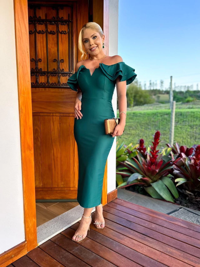 Vestido confeccionado na prada premium. Seu comprimento midi adiciona um toque moderno e elegante, enquanto a modelagem justa e a fenda atrás cria um visual único, valorizando o corpo. Este vestido de ombro a ombro é um verdadeiro espetáculo, com o detalhe de babado nos ombros que adiciona elegância e sofisticação. A combinação do brilho sútil do tecido com os detalhes cuidadosamente elaborados certamente fará com que você se sinta deslumbrante e confiante. Este vestido é uma escolha perfeita para ocasiões especiais, onde você certamente irá se destacar pela sua elegância e charme!